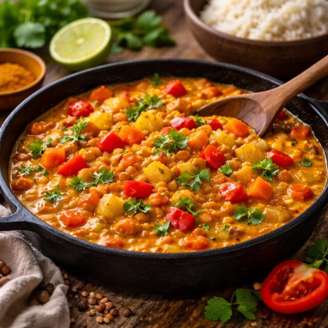 Sīpolu un ķiploku sakapā, apcep eļļā. Pievieno sagrieztus dārzeņus un karija garšvielu. Pievieno lēcas, nedaudz ūdens un vāra līdz mīkstas. Pielej kokosriekstu pienu, pievieno sāli un vāra vēl dažas minūtes.