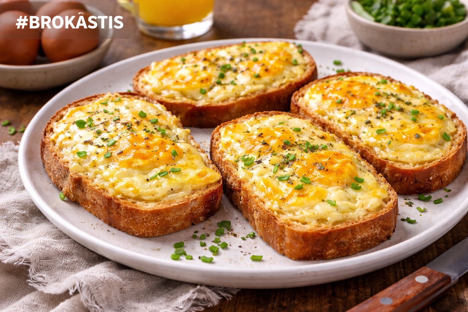 Cep cepeškrāsnī 180 °C apmēram 10–12 minūtes, līdz siers izkusis un ola sarecējusi.