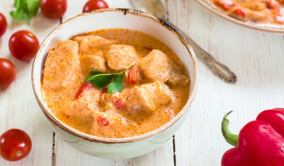 Apcep sīpolu un ķiploku līdz mīksti. Pievieno sagrieztu vistas fileju, apcep. Pielej saldo krējumu, pievieno garšvielas un sautē 10–15 minūtes. Lieliski garšo ar rīsiem vai kartupeļiem.